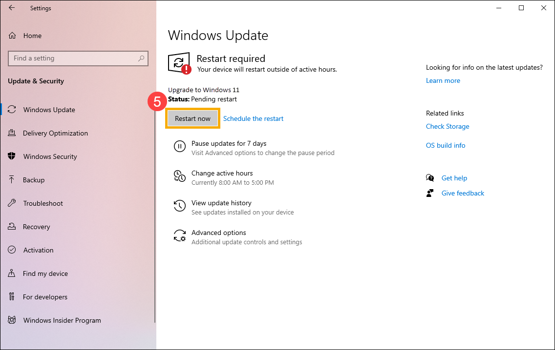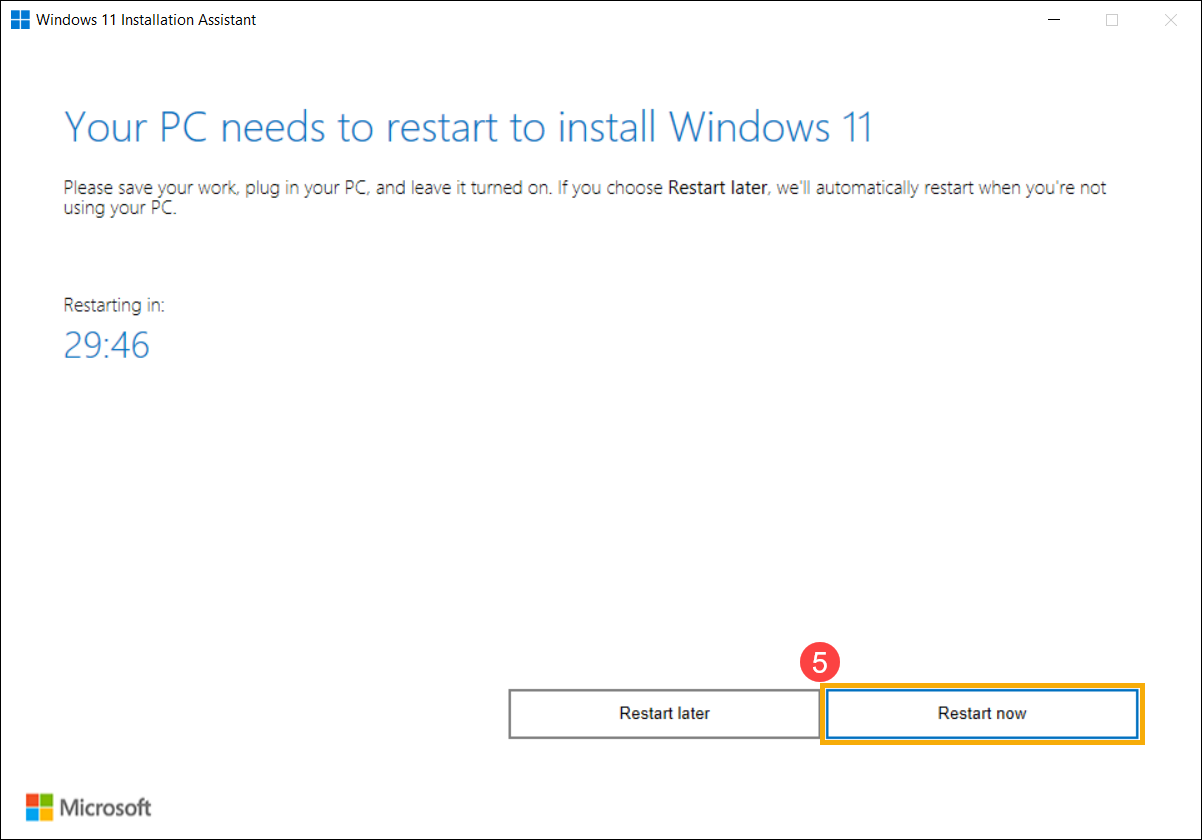 - 다운로드가 완료되면 [지금 다시 시작]⑤을 클릭하여 Windows 11 설치를 시작합니다.
