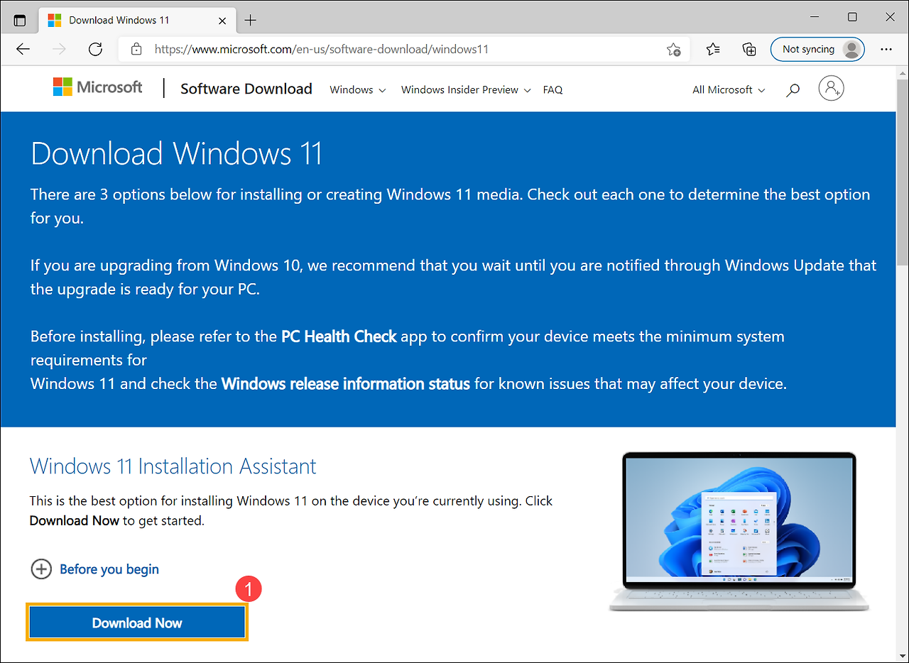 - 설치 도우미 도구를 다운로드하려면 Microsoft 공식 웹사이트로 이동하세요. [지금 다운로드]①를 클릭하여 Windows 11 설치 도우미 도구 다운로드를 시작합니다.