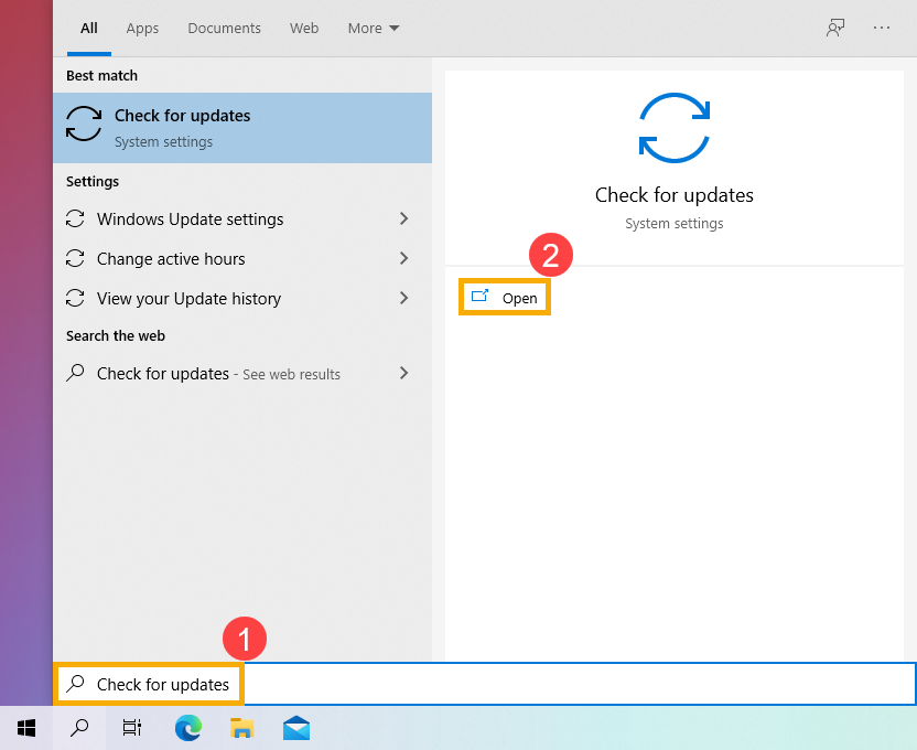 - Windows 검색 창①에 [업데이트 확인]을 입력하고 검색한 다음 [열기]②를 클릭합니다.